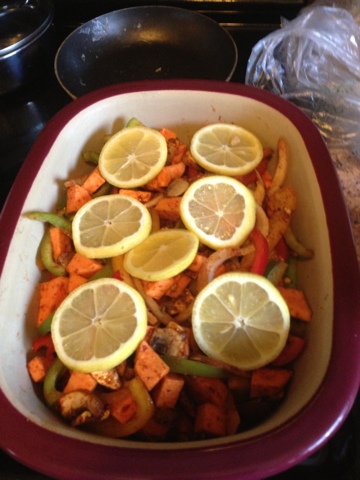 I rubbed the sauce on the chicken and threw them into my deep covered baker. Then I tossed the veggies in the rub and threw them on top, the lemon spread across the very top. Bake for 45 minutes at 425.